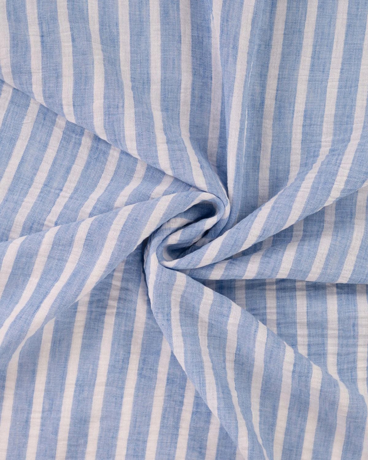 Tissu rayures aspect lin bleu, tissé en armure toile. Il séduit par son effet lin naturel et ses élégantes rayures bleues. Confectionné en 100 % polyester avec des fils teints et finition lavée, il offre une belle tenue, une bonne résistance et un toucher légèrement texturé. Idéal pour la confection de chemisiers, pantalons, jupes ou robes, pour toute la famille.