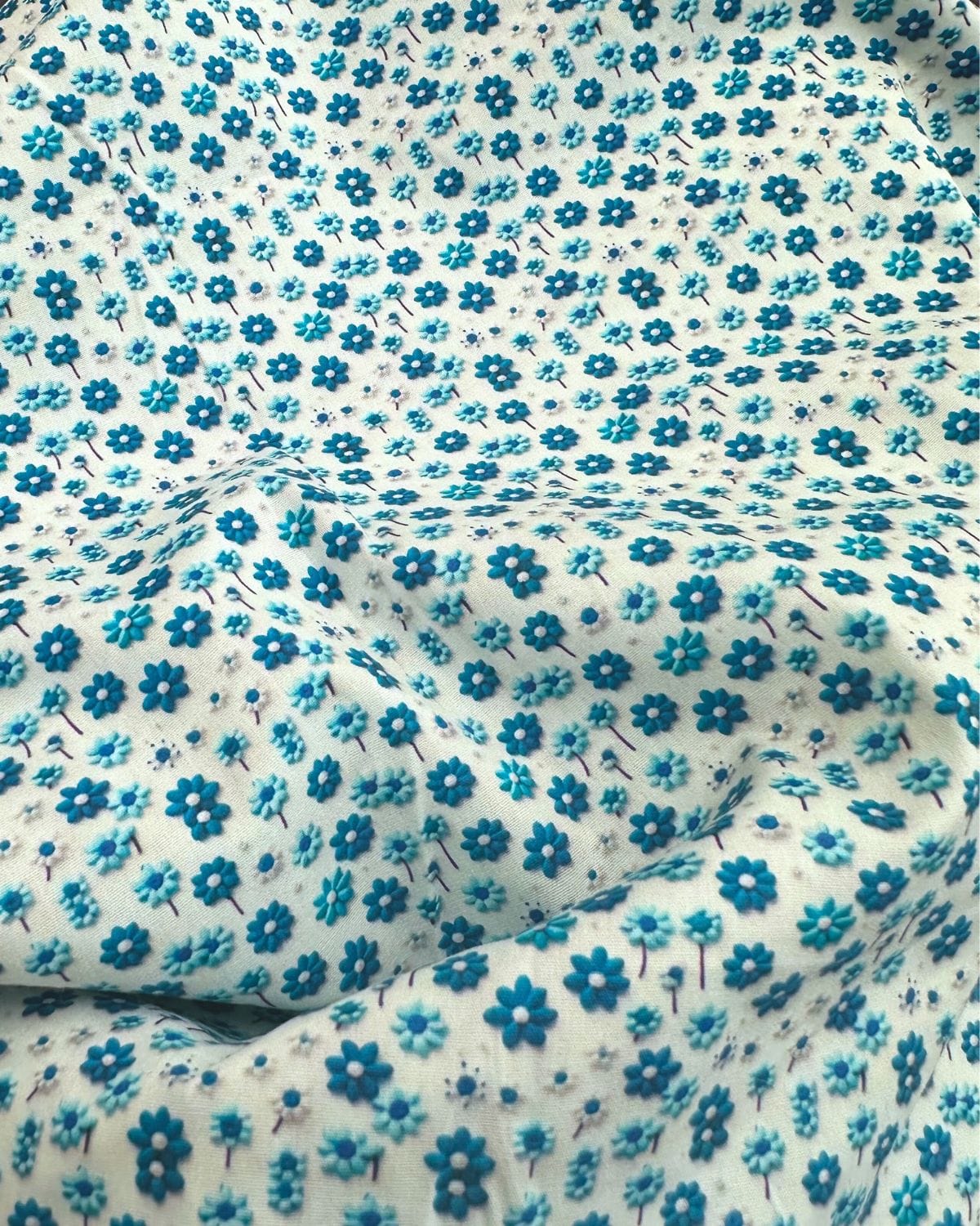 Tissu coton 3D imprimé fleuri bleu certifié oeko-tex® standard 100. Tissu à impression numérique pour plus de détails et faire vivre vos créations enfants (décoration de chambre, habillement, accessoires…)