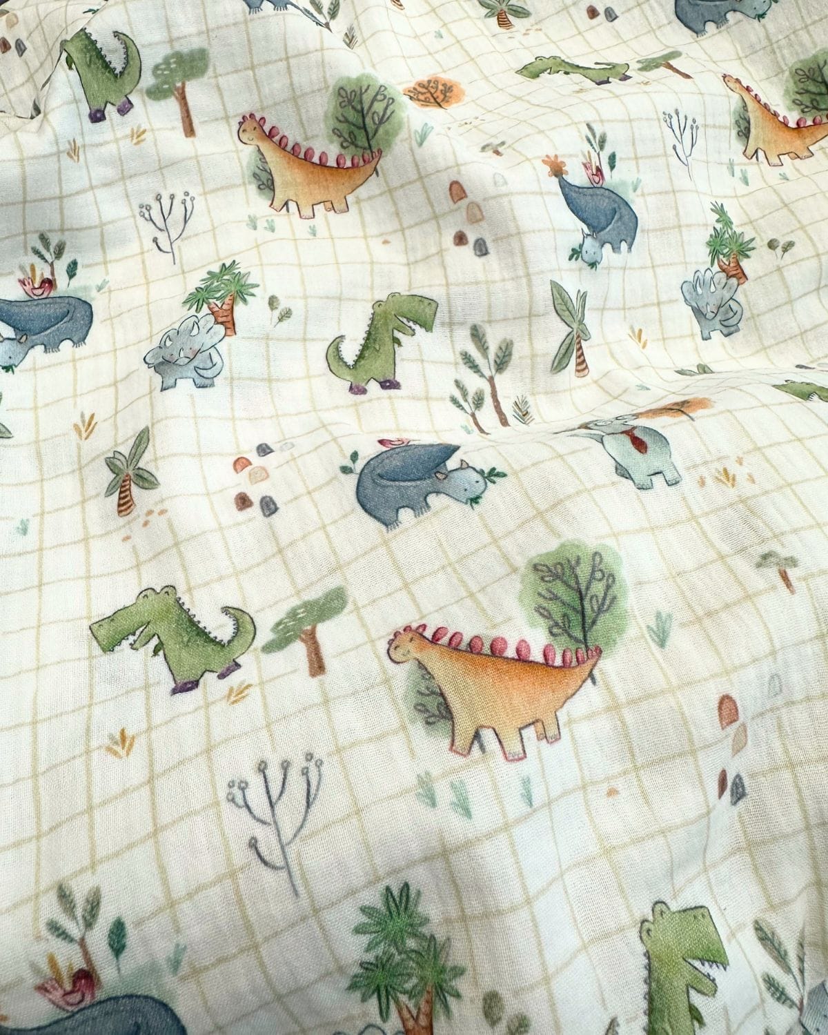 Cette double gaze imprimé dinosaure en quadrillage est un nouveau motif fantaisie certifié oeko-tex standard 100 pour vos créations pour les petits garçons (parures de lit, habillements, accessoires…)label oeko-tex