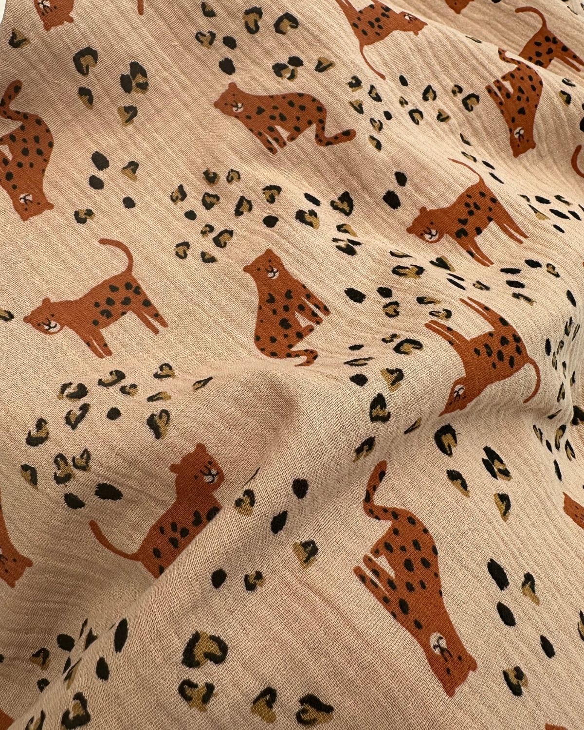 Cette jolie double gaze gaufrée imprimé léopard vieux rose fait son entrée dans notre collection printemps été 2026. Ce tissu animalier est certifié oeko-tex standard 100, tissu léger et aérien idéal pour vos projets couture en habillement, accessoires et ameublement légers.label oeko-tex