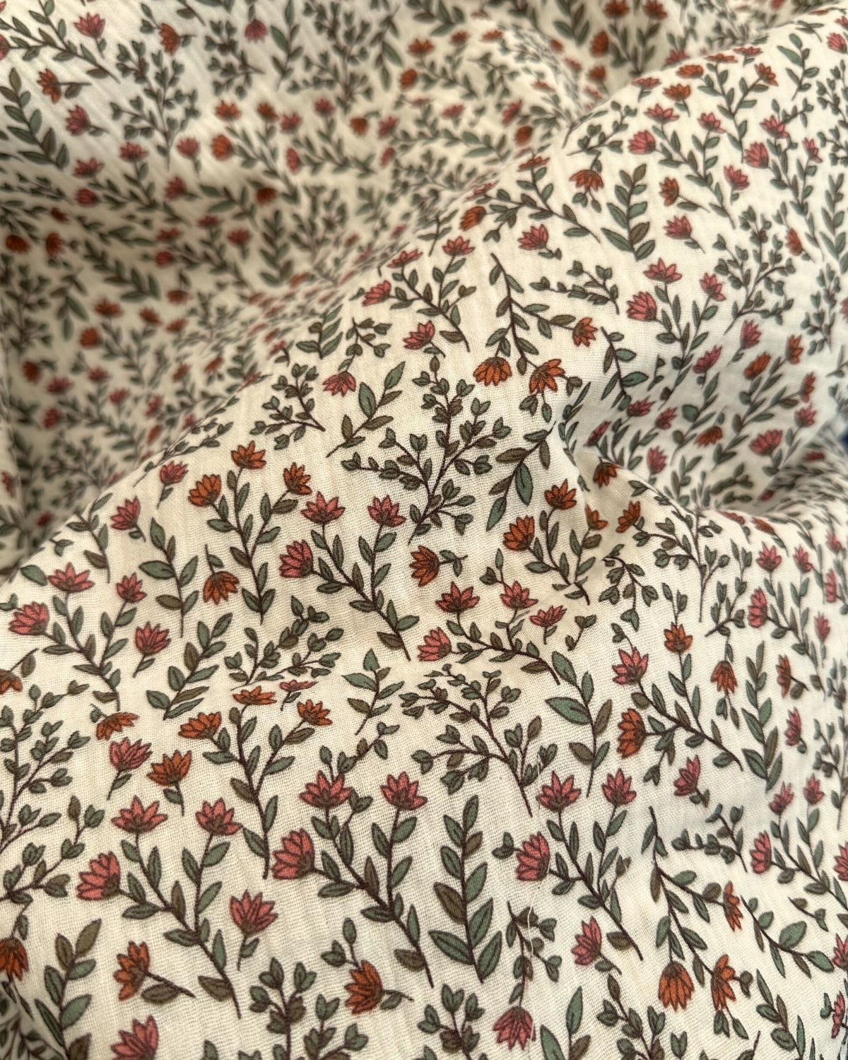Cette double gaze imprimé petite fleur camel et vert fond écru est un nouveau motif certifié oeko-tex standard 100 dans notre collection de double gazes gaufrées.label oeko-tex