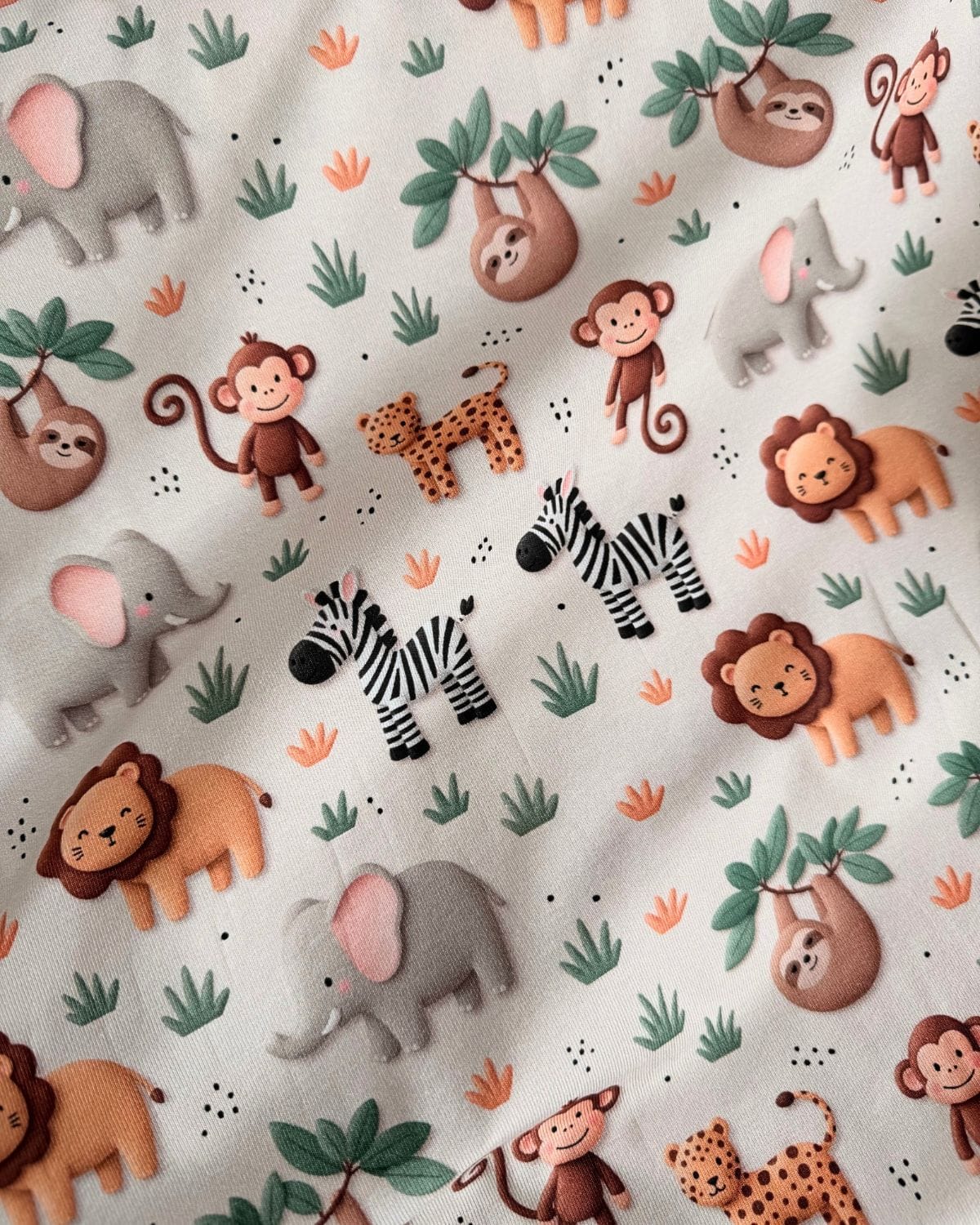 Tissu jersey coton imprimé 3D animaux sauvages coloris gris perle à la fois douillet chaud pour vos confections d’habillements automne-hiver. Tissu stretch sur la largeur facile à travailler pour vos sweats, robes, jupes, pantalons pour enfants et tout-petts.