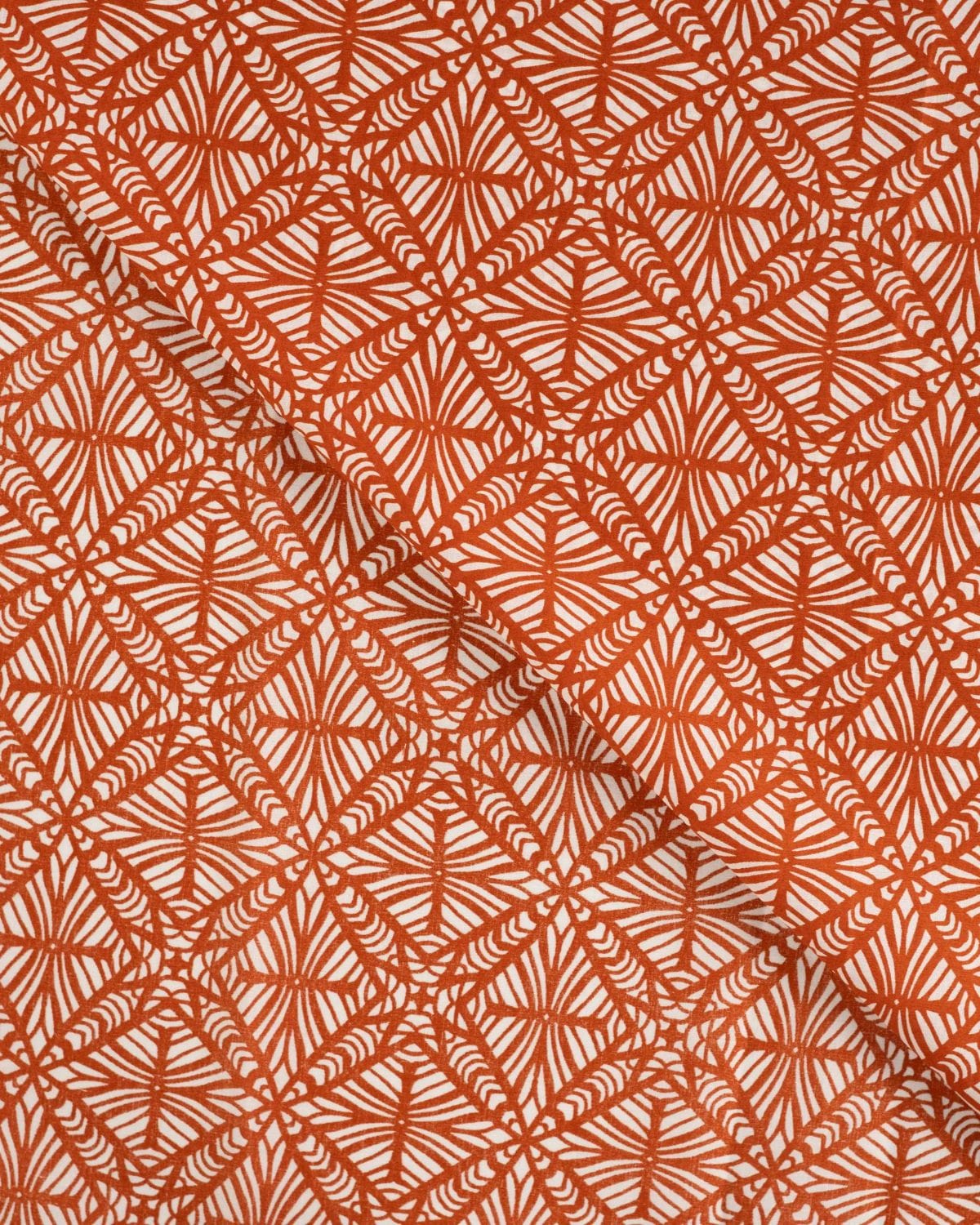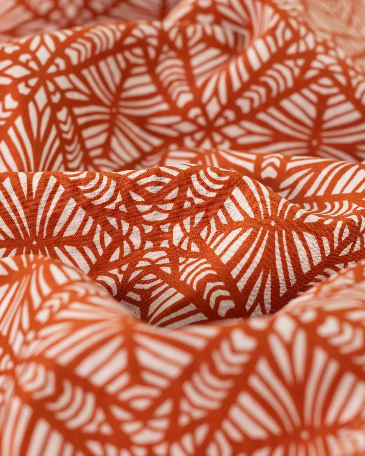 Ce tissu voile coton imprimé rétro cognac dispose d’une texture bien plus fluide et soyeuse que la traditionnelle popeline de coton. Tissu sur support voile de coton léger et aérien.
