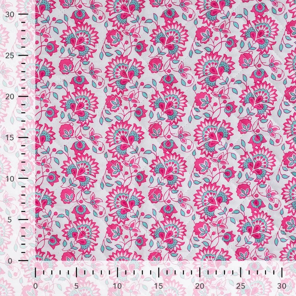 Tissu voile de coton matelassé fleur indienne réversible fuchsia et blanc que vous pouvez employer pour confectionner des manteaux chauds gonflants, des sacs à langer, trousses, ou autres objets décoratifs (coussins, oreillers…)