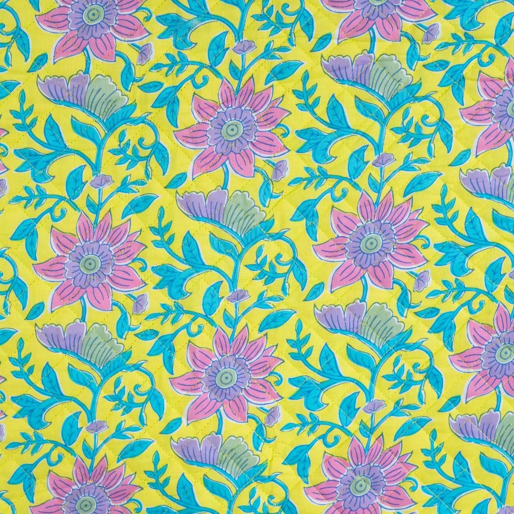 Voile de Coton Matelassé Fleur Indienne Réversible Rayure Jaune Rose Bleu